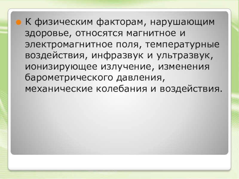 температурные воздействия, инфразвук и ультразвук, ионизирующее излучение, изменения барометрического давления,