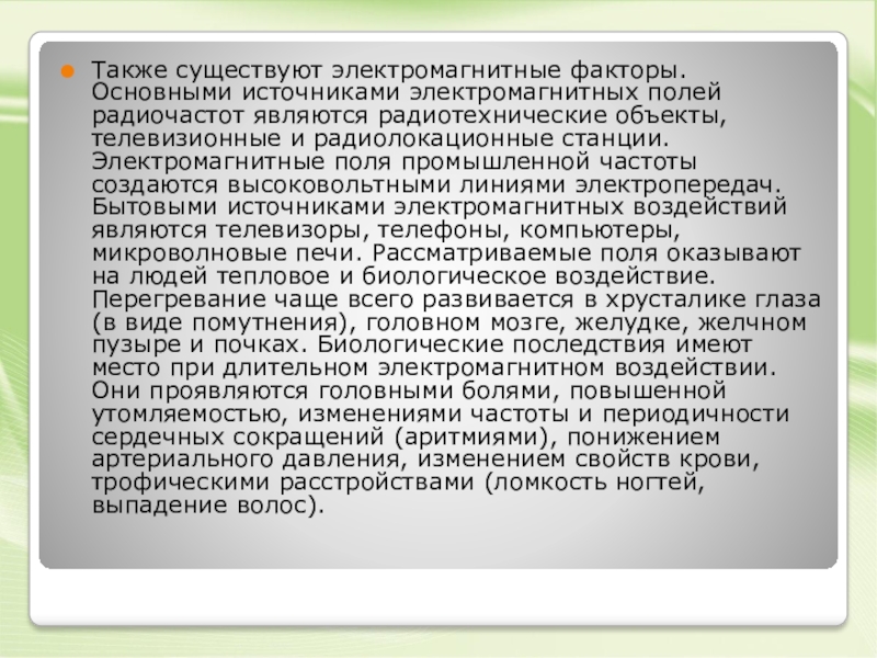 Слайд 28Также существуют электромагнитные факторы. Основными источниками электромагнитных полей радиочастот являются