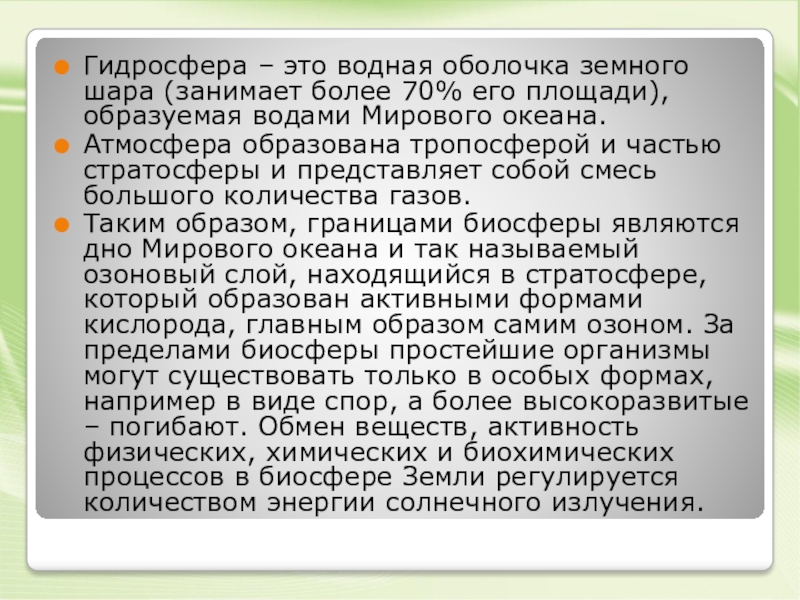 Таким образом, границами биосферы являются дно Мирового океана и так называемый озоновый слой, находящийся в стратосфере, который образован активными формами кислорода, главным образом самим озоном. За пределами биосферы простейшие организмы могут существовать только в особых формах, например в виде спор, а более высокоразвитые – погибают. Обмен веществ, активность физических, химических и биохимических процессов в биосфере Земли регулируется количеством энергии солнечного излучения.