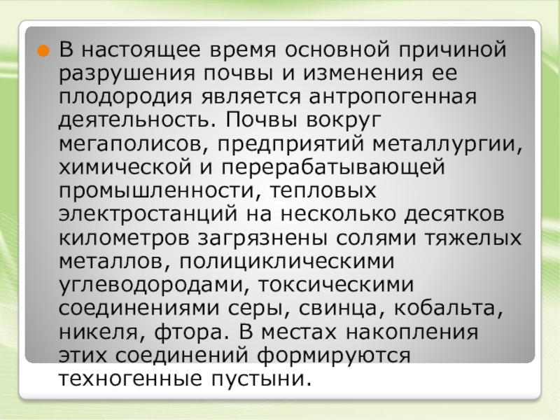 плодородия является антропогенная деятельность. Почвы вокруг мегаполисов, предприятий металлургии, химической