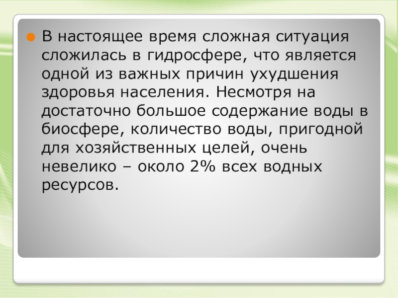 большое содержание воды в биосфере, количество воды, пригодной для хозяйственных целей, очень невелико – около 2% всех водных ресурсов.
