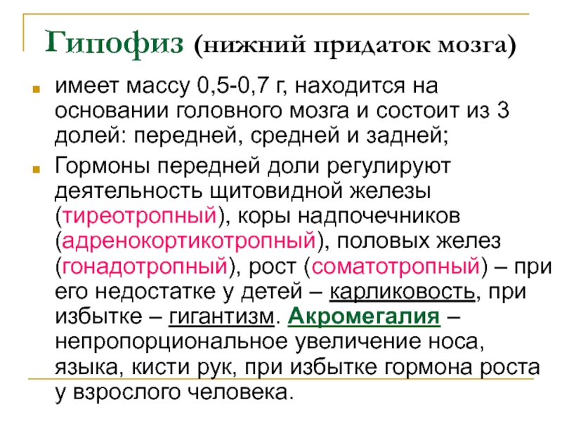 Гормоны передней доли регулируют деятельность щитовидной железы (тиреотропный), коры надпочечников (адренокортикотропный), половых желез (гонадотропный), рост (соматотропный) – при его недостатке у детей – карликовость, при избытке – гигантизм. Акромегалия – непропорциональное увеличение носа, языка, кисти рук, при избытке гормона роста у взрослого человека.