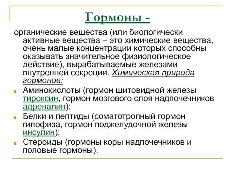 вырабатываемые железами внутренней секреции. Химическая природа гормонов: