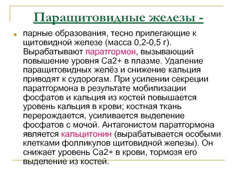 (масса 0,2-0,5 г). Вырабатывают паратгормон, вызывающий повышение уровня Ca2+ в
