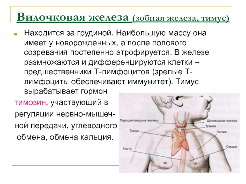 железе размножаются и дифференцируются клетки – предшественники Т-лимфоцитов (зрелые Т-лимфоциты обеспечивают иммунитет). Тимус вырабатывает гормон