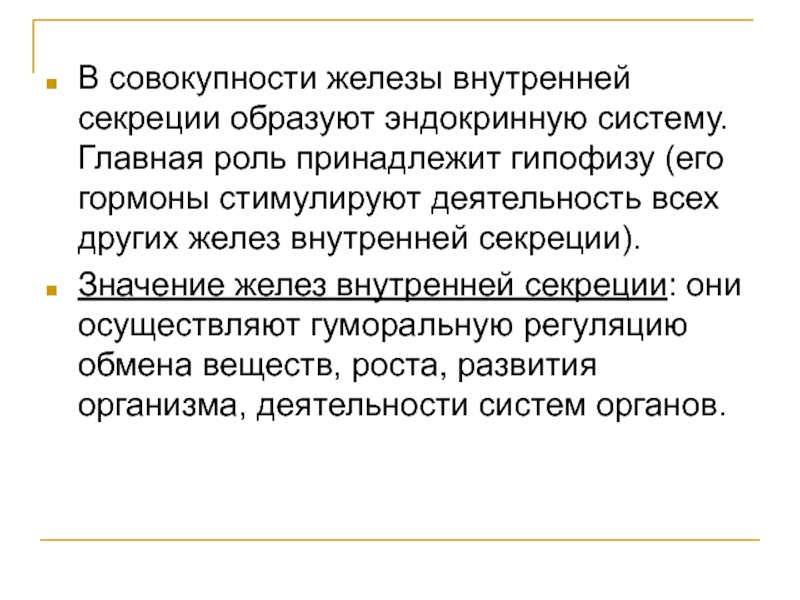 Слайд 16В совокупности железы внутренней секреции образуют эндокринную систему. Главная роль