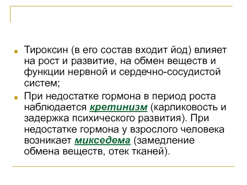 недостатке гормона в период роста наблюдается кретинизм (карликовость и задержка психического развития). При недостатке гормона у взрослого человека возникает микседема (замедление обмена веществ, отек тканей).