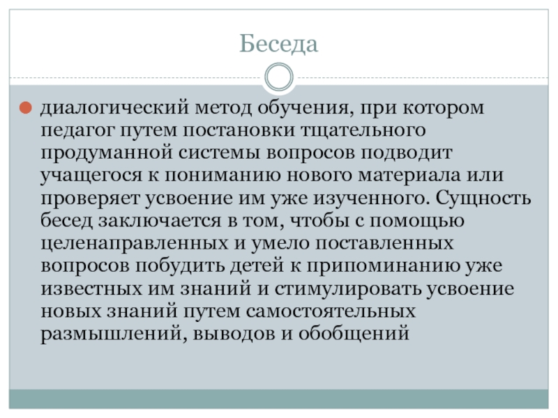 усвоение им уже изученного. Сущность бесед заключается в том, чтобы с помощью целенаправленных и умело поставленных вопросов побудить детей к припоминанию уже известных им знаний и стимулировать усвоение новых знаний путем самостоятельных размышлений, выводов и обобщений