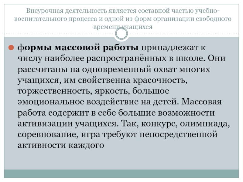 наиболее распространённых в школе. Они рассчитаны на одновременный охват многих учащихся, им свойственна красочность, торжественность, яркость, большое эмоциональное воздействие на детей. Массовая работа содержит в себе большие возможности активизации учащихся. Так, конкурс, олимпиада, соревнование, игра требуют непосредственной активности каждого