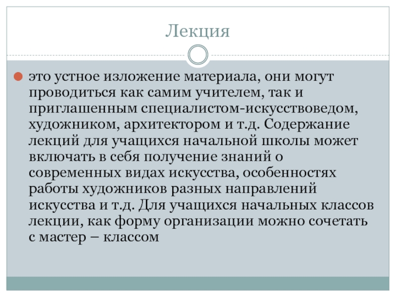для учащихся начальной школы может включать в себя получение знаний о современных видах искусства, особенностях работы художников разных направлений искусства и т.д. Для учащихся начальных классов лекции, как форму организации можно сочетать с мастер – классом