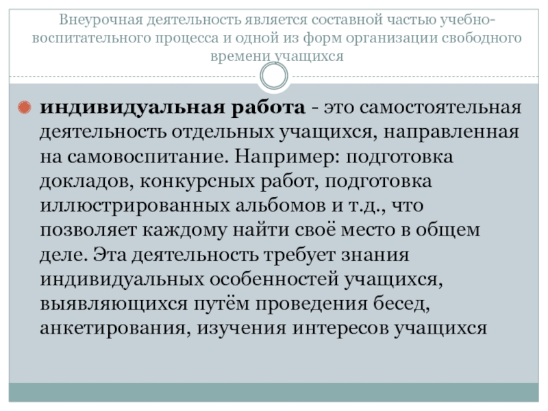 отдельных учащихся, направленная на самовоспитание. Например: подготовка докладов, конкурсных работ, подготовка иллюстрированных альбомов и т.д., что позволяет каждому найти своё место в общем деле. Эта деятельность требует знания индивидуальных особенностей учащихся, выявляющихся путём проведения бесед, анкетирования, изучения интересов учащихся