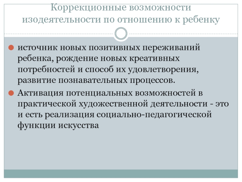 Слайд 22Коррекционные возможности изодеятельности по отношению к ребенку