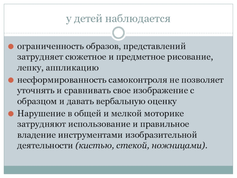Нарушение в общей и мелкой моторике затрудняют использование и правильное владение инструментами изобразительной деятельности (кистью, стекой, ножницами).