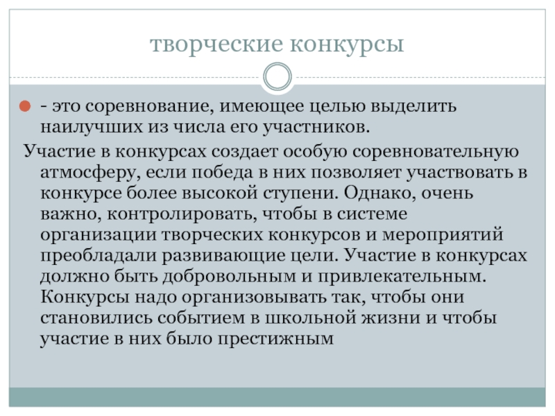 в них позволяет участвовать в конкурсе более высокой ступени. Однако, очень важно, контролировать, чтобы в системе организации творческих конкурсов и мероприятий преобладали развивающие цели. Участие в конкурсах должно быть добровольным и привлекательным. Конкурсы надо организовывать так, чтобы они становились событием в школьной жизни и чтобы участие в них было престижным