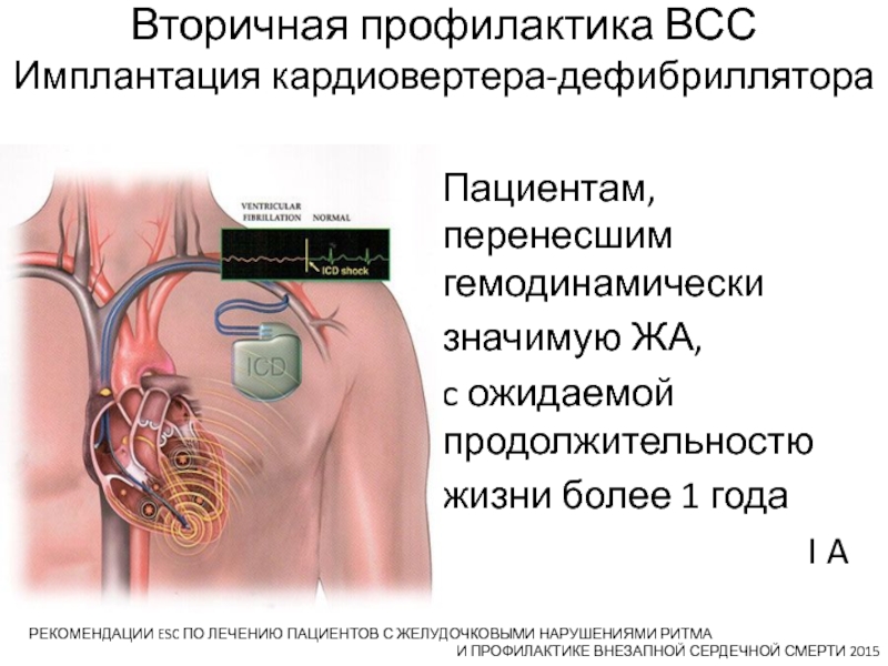+ бета-блокаторы - вторичная профилактика ВСС у больных со злокачественными желудочковыми аритмиями, являются единственной лекарственной альтернативой ИКД, способной не только предупреждать рецидивы ЖТ, но и увеличивать продолжительность жизни этих пациентов.