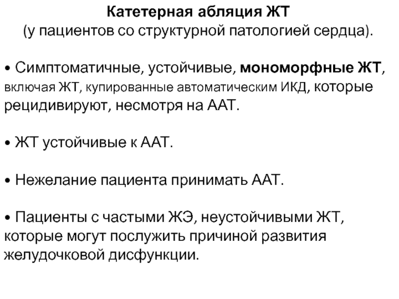 устойчивые, мономорфные ЖТ, включая ЖТ, купированные автоматическим ИКД, которые рецидивируют,