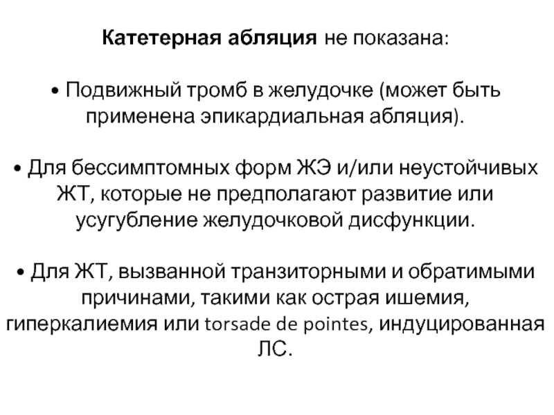 • Для ЖТ, вызванной транзиторными и обратимыми причинами, такими как острая ишемия, гиперкалиемия или torsade de pointes, индуцированная ЛС.