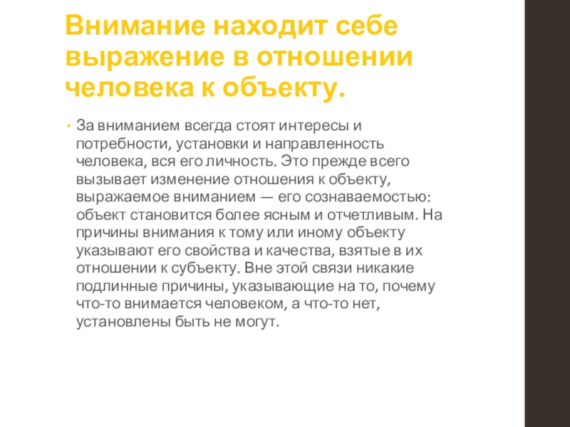 его личность. Это прежде всего вызывает изменение отношения к объекту, выражаемое вниманием — его сознаваемостью: объект становится более ясным и отчетливым. На причины внимания к тому или иному объекту указывают его свойства и качества, взятые в их отношении к субъекту. Вне этой связи никакие подлинные причины, указывающие на то, почему что-то внимается человеком, а что-то нет, установлены быть не могут.