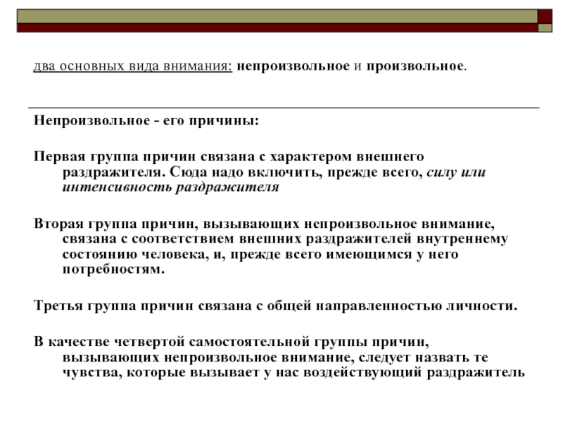 В качестве четвертой самостоятельной группы причин, вызывающих непроизвольное внимание, следует назвать те чувства, которые вызывает у нас воздействующий раздражитель