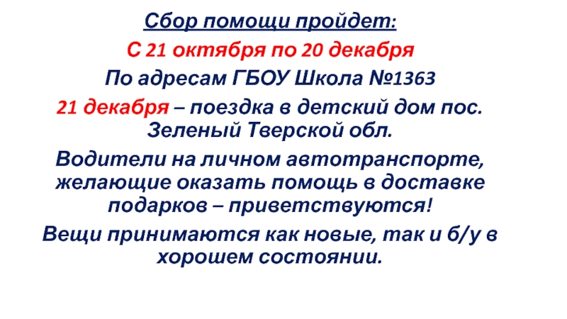 Сбор помощи пройдет:С 21 октября по 20 декабряПо адресам ГБОУ Школа №136321 декабря – поездка в детский дом пос. Зеленый Тверской обл. Водители на личном автотранспорте, желающие оказать помощь в доставке