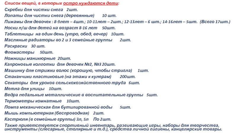Список вещей, в которых остро нуждаются дети:Скребки для чистки снега	2шт.Лопаты для чистки снега (деревянные)	10 шт.Пижамы для девочек