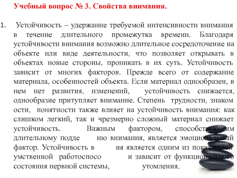 интенсивности внимания в течение длительного промежутка времени. Благодаря устойчивости внимания