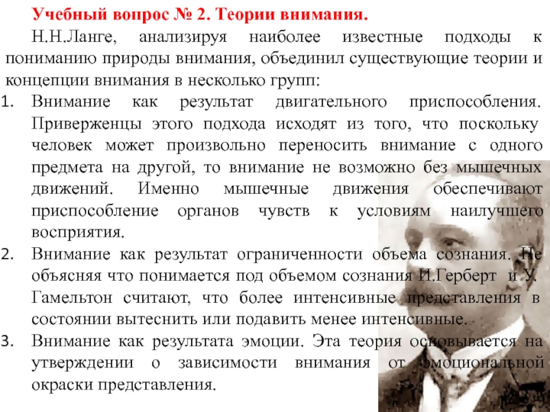 Слайд 7Учебный вопрос № 2. Теории внимания.