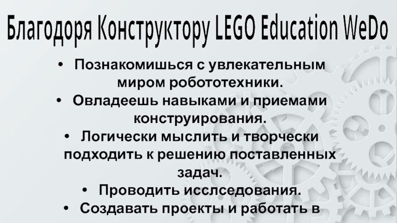 Слайд 4Благодоря Конструктору LEGO Education WeDo