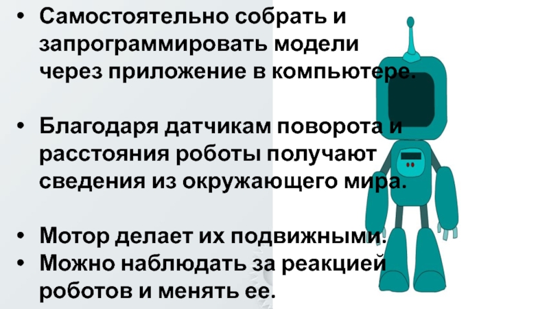 Самостоятельно собрать и запрограммировать модели через приложение в компьютере.Благодаря датчикам поворота и расстояния роботы получают сведения из