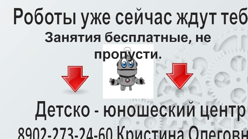 8902-273-24-60 Кристина ОлеговнаДетско - юношеский центрРоботы уже сейчас ждут тебя!!! Занятия бесплатные, не пропусти.