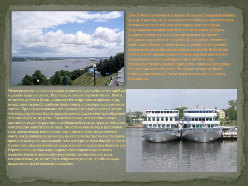 Непосредственно после прохода весеннего льда начинается прибыль и разлив воды на Волге. Впрочем, горизонт верхней части Волги, от истока до устья Камы, возвышается и при самом проходе льда, вследствие сильной прибыли воды сверху и подпора льда в нижних частях. Причем возвышение это происходит иногда столь быстро, что вода в притоках Волги задерживается и даже получает обратное течение вверх от их устья. Случается также, что весенние воды достигают полного разлива и наибольшей высоты прежде, чем река совершенно очистится ото льда. Высота весенних вод в различные годы значительно изменяется, она определяется по количеству снега, сохранившегося до весны, по степени быстроты его таяния и времени наступления высокой температуры во всем бассейне Волги. Кроме того, высота весенней воды зависит от характера берегов: где берега низки, расход воды выражается широким разливом и незначительным возвышением уровня; где они высоки и где, следовательно, не может быть широкого разлива, прибыль воды выражается значительным подъемом.