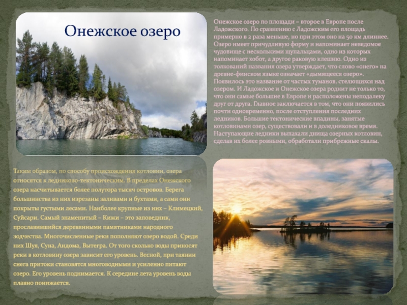 Онежское озеро по площади – второе в Европе после Ладожского. По сравнению с Ладожским его площадь примерно в 2 раза меньше, но при этом оно на 50 км длиннее. Озеро имеет причудливую форму и напоминает неведомое чудовище с несколькими щупальцами, одно из которых напоминает хобот, а другое раковую клешню. Одно из толкований названия озера утверждает, что слово «онего» на древне-финском языке означает «дымящееся озеро». Появилось это название от частых туманов, стелющихся над озером. И Ладожское и Онежское озера роднит не только то, что они самые большие в Европе и расположены неподалеку друг от друга. Главное заключается в том, что они появились почти одновременно, после отступления последних ледников. Большие тектонические впадины, занятые котловинами озер, существовали и в доледниковое время. Наступающие ледники выпахали днища озерных котловин, сделав их более ровными, обработали прибрежные скалы.