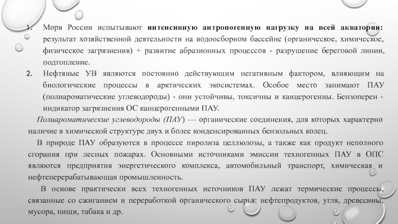 Нефтяные УВ являются постоянно действующим негативным фактором, влияющим на биологические процессы в арктических экосистемах. Особое место занимают ПАУ (полиароматические углеводороды) - они устойчивы, токсичны и канцерогенны. Бензоперен - индикатор загрязнения ОС канцерогенными ПАУ.