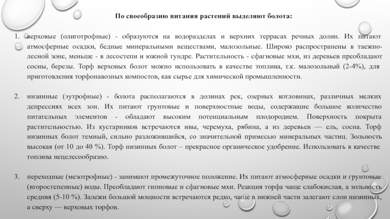 1. низинные/эвтрофные - питаются грунтовыми водами, следовательно, богаты минеральными веществами, расположены в местах выхода грунтовых вод на поверхность. Есть во всех природных зонах.