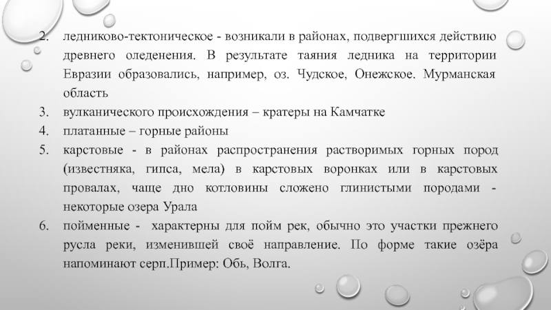 Слайд 5ледниково-тектоническое - возникали в районах, подвергшихся действию древнего оледенения. В