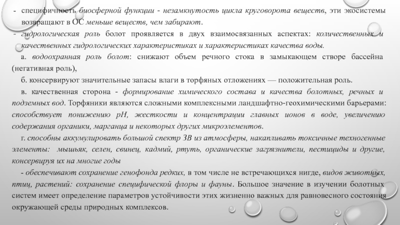 в. качественная сторона - формирование химического состава и качества болотных, речных и подземных вод. Торфяники являются сложными комплексными ландшафтно-геохимическими барьерами: способствует понижению рН, жесткости и концентрации главных ионов в воде, увеличению содержания органики, марганца и некоторых других микроэлементов.