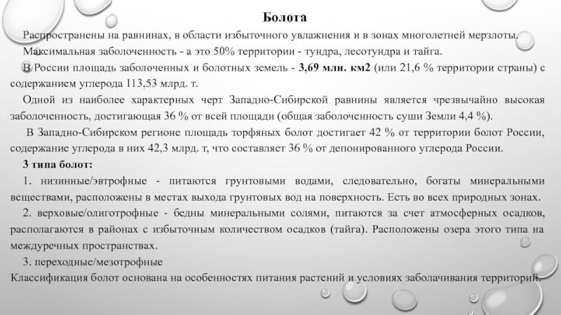 мощном влиянии на формирование теплового и водного баланса территории. Величина радиационного баланса болот в тайге препятствует смещению границы распространения зоны вечной мерзлоты; за летние месяцы с болот Западно-Сибирской равнины выносится в среднем 300 км3 испарившейся влаги на территорию Восточной Сибири и Казахстана.