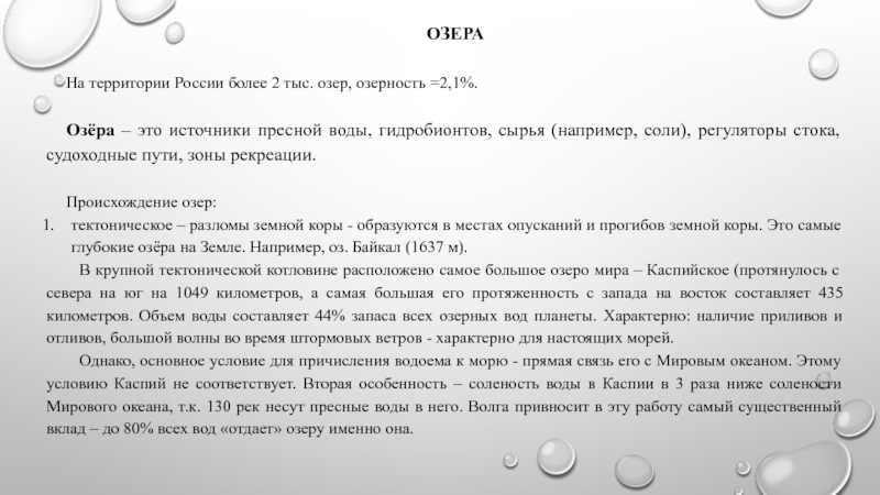 На территории России более 2 тыс. озер, озерность =2,1%.