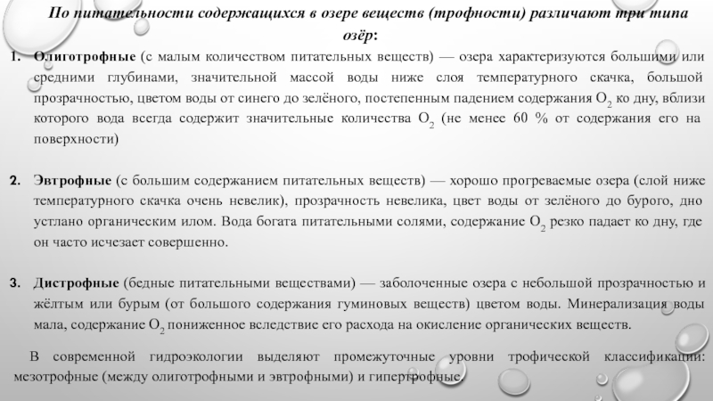 Слайд 6По питательности содержащихся в озере веществ (трофности) различают три типа