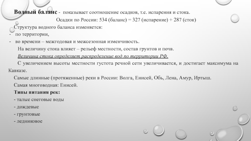 Слайд 2Водный баланс - показывает соотношение осадков, т.е. испарения и стока.