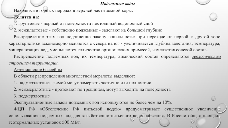 ФЦП РФ «Обеспечение РФ питьевой водой» предусматривает существенное увеличение использования подземных вод для хозяйственно-питьевого водоснабжения. В России общая площадь геотермальных установок 500 МВт.