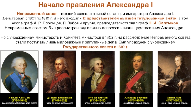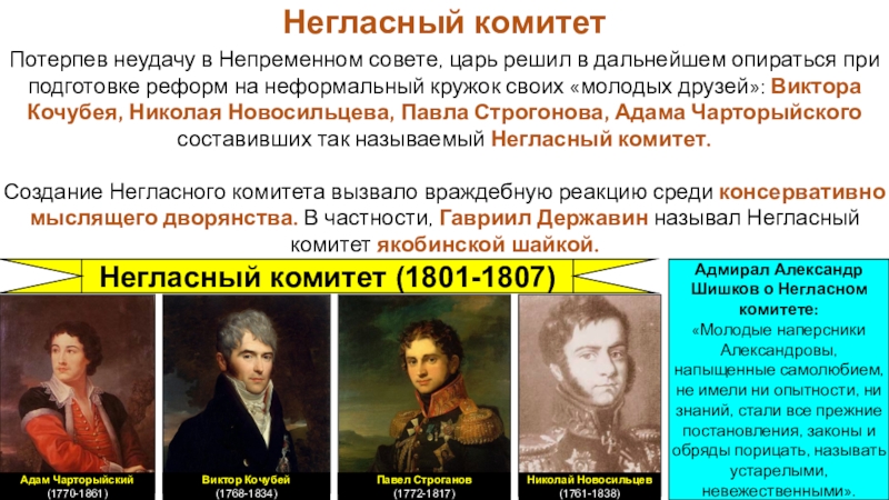 Однако даже Негласный комитет, ближайшие сподвижники Александра выступили против какого-либо ограничения самодержавия: они отвергли проект реорганизации Сената, который предполагалось превратить в высший орган законосовещательной, исполнительной и судебной власти.