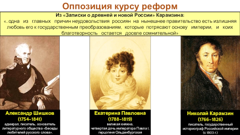 «Молодые наперсники Александровы, напыщенные самолюбием, не имели ни опытности, ни знаний, стали все прежние постановления, законы и обряды порицать, называть устарелыми, невежественными».