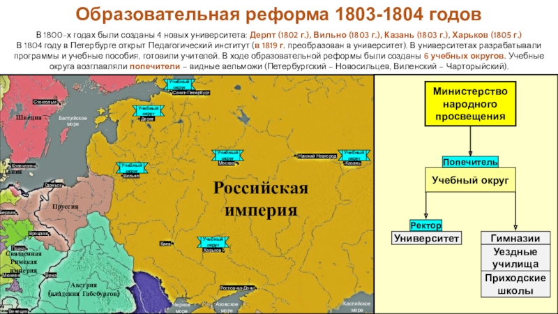 В 1804 году в Петербурге открыт Педагогический институт (в 1819 г. преобразован в университет). В университетах разрабатывали программы и учебные пособия, готовили учителей. В ходе образовательной реформы были созданы 6 учебных округов. Учебные округа возглавляли попечители – видные вельможи (Петербургский – Новосильцев, Виленский – Чарторыйский).