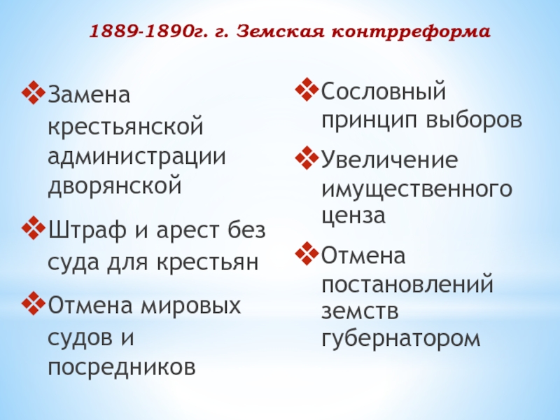 цензуры (1882), введение сословных принципов в начальной и средней школе, отмена автономии университетов (1884), введение института земских начальников (1889), установление бюрократической опеки над земским (1890) и городским (1892) самоуправлением.