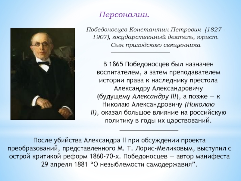 После убийства Александра II при обсуждении проекта преобразований, представленного М. Т. Лорис-Меликовым, выступил с острой критикой реформ 1860-70-х. Победоносцев — автор манифеста 29 апреля 1881 “О незыблемости самодержавия”.