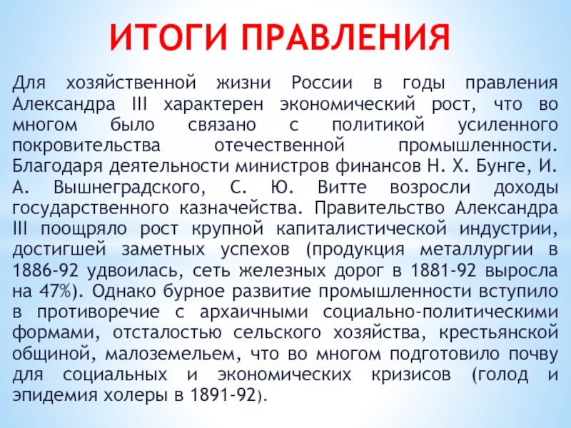 усиленного покровительства отечественной промышленности. Благодаря деятельности министров финансов Н. Х. Бунге, И. А. Вышнеградского, С. Ю. Витте возросли доходы государственного казначейства. Правительство Александра III поощряло рост крупной капиталистической индустрии, достигшей заметных успехов (продукция металлургии в 1886-92 удвоилась, сеть железных дорог в 1881-92 выросла на 47%). Однако бурное развитие промышленности вступило в противоречие с архаичными социально-политическими формами, отсталостью сельского хозяйства, крестьянской общиной, малоземельем, что во многом подготовило почву для социальных и экономических кризисов (голод и эпидемия холеры в 1891-92).