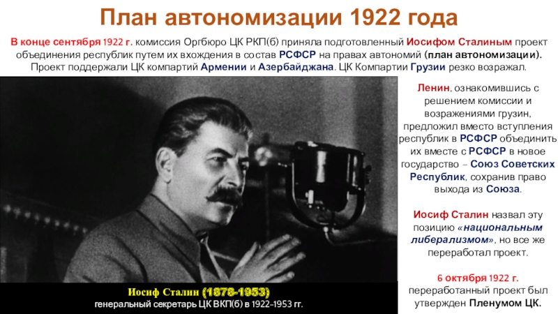 В конце сентября 1922 г. комиссия Оргбюро ЦК РКП(б) приняла подготовленный Иосифом Сталиным проект объединения республик путем их вхождения в состав РСФСР на правах автономий (план автономизации). Проект поддержали ЦК компартий Армении и Азербайджана. ЦК Компартии Грузии резко возражал.