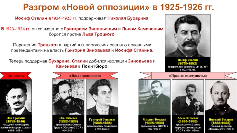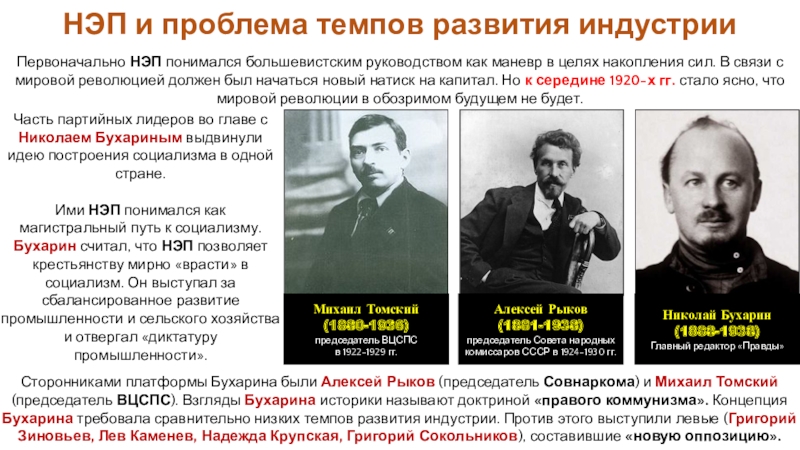 Сторонниками платформы Бухарина были Алексей Рыков (председатель Совнаркома) и Михаил Томский (председатель ВЦСПС). Взгляды Бухарина историки называют доктриной «правого коммунизма». Концепция Бухарина требовала сравнительно низких темпов развития индустрии. Против этого выступили левые (Григорий Зиновьев, Лев Каменев, Надежда Крупская, Григорий Сокольников), составившие «новую оппозицию».