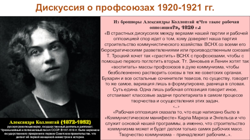 Из брошюры Александры Коллонтай «Что такое рабочая оппозиция?», 1920 г.: